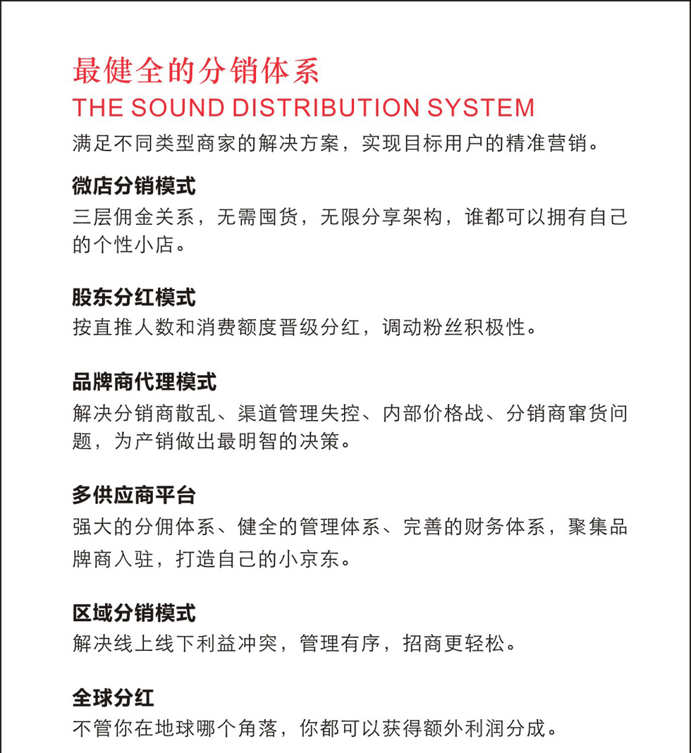 强大的分佣体系,健全的管理体系,完善的财务体系,聚集品牌商入驻,打造自己的小京东。